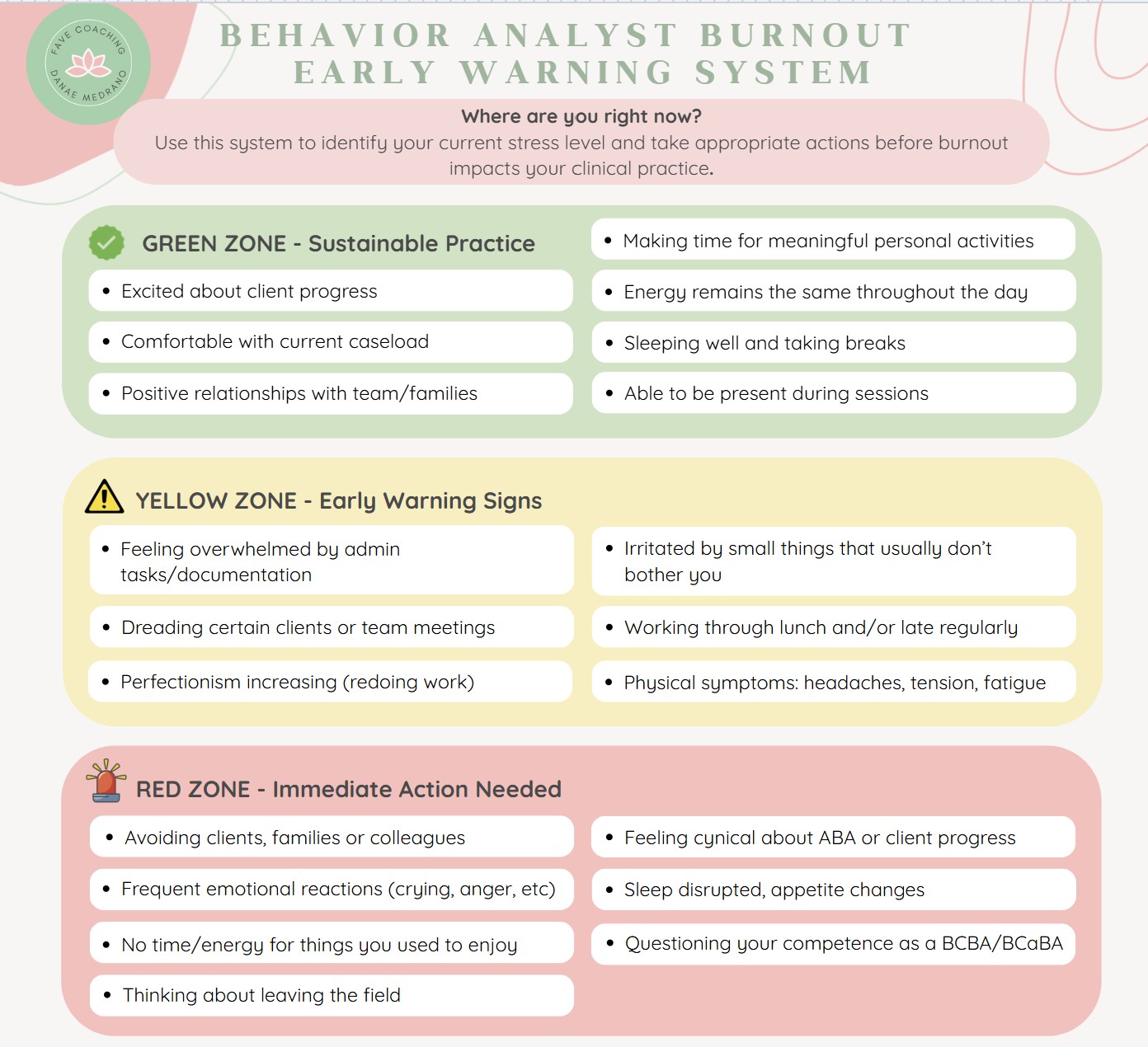 An early warning system for behavior analyst burnout. Three zones (Green/Yellow/Red) visual assessment identifies your stress level using profession-specific indicators. Includes 3 emergency strategies for immediate relief and 10 evidence based micro-strategies along with setting specific recommendations. Systematic approach prevents talented behavior analysts from leaving the field due to preventable burnout.